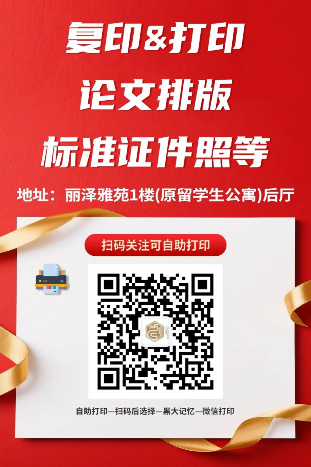 地址:A区红房子“黑大·記憶”主题文创店;C区丽泽雅苑一楼大厅(复印店在一楼后厅)。