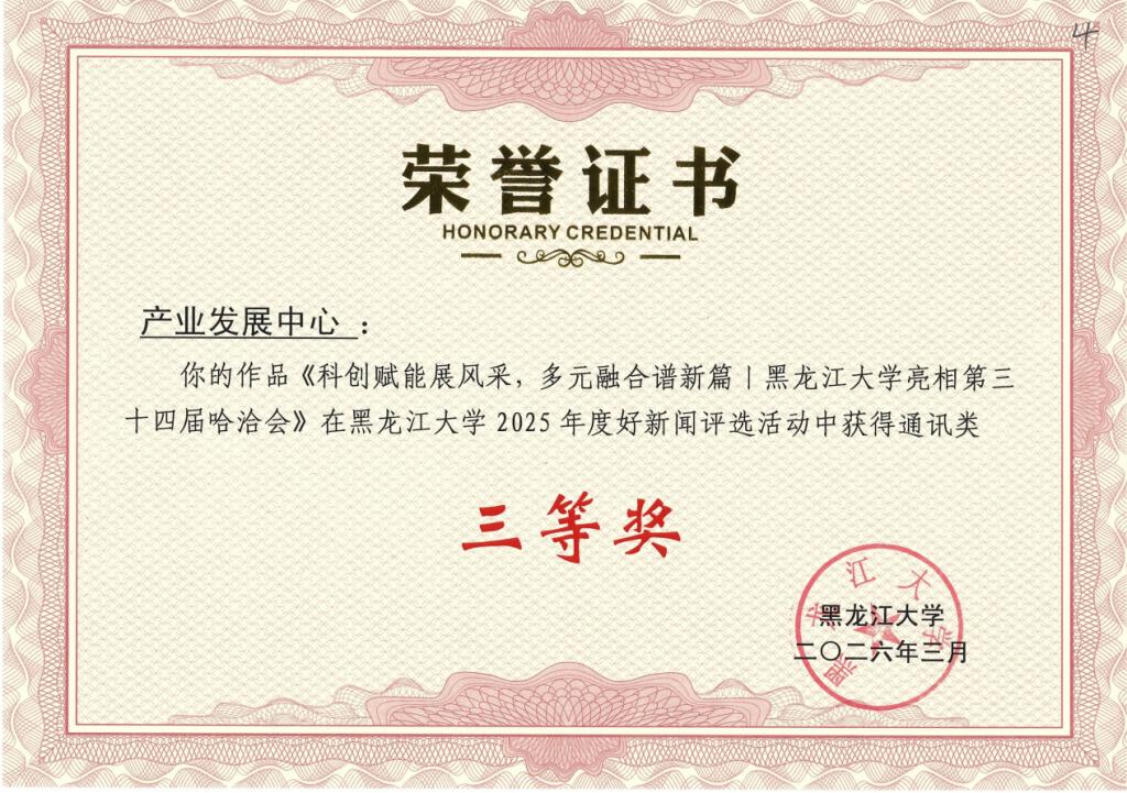 近日,黑龙江大学 2025 年度好新闻评选结果正式揭晓。由产业发展中心创作的通讯作品《科技赋能展风采,多元融合谱新篇丨黑龙江大学两项成果亮相第三十四届哈洽会》,依托详实鲜活的素材、鲜明突出的核心主旨与精炼专业的行文风格,荣获通讯类三等奖殊荣。